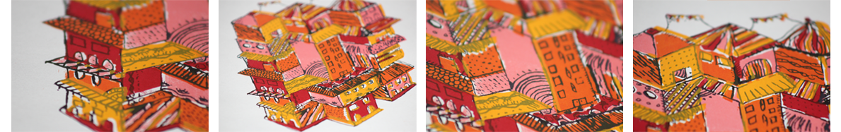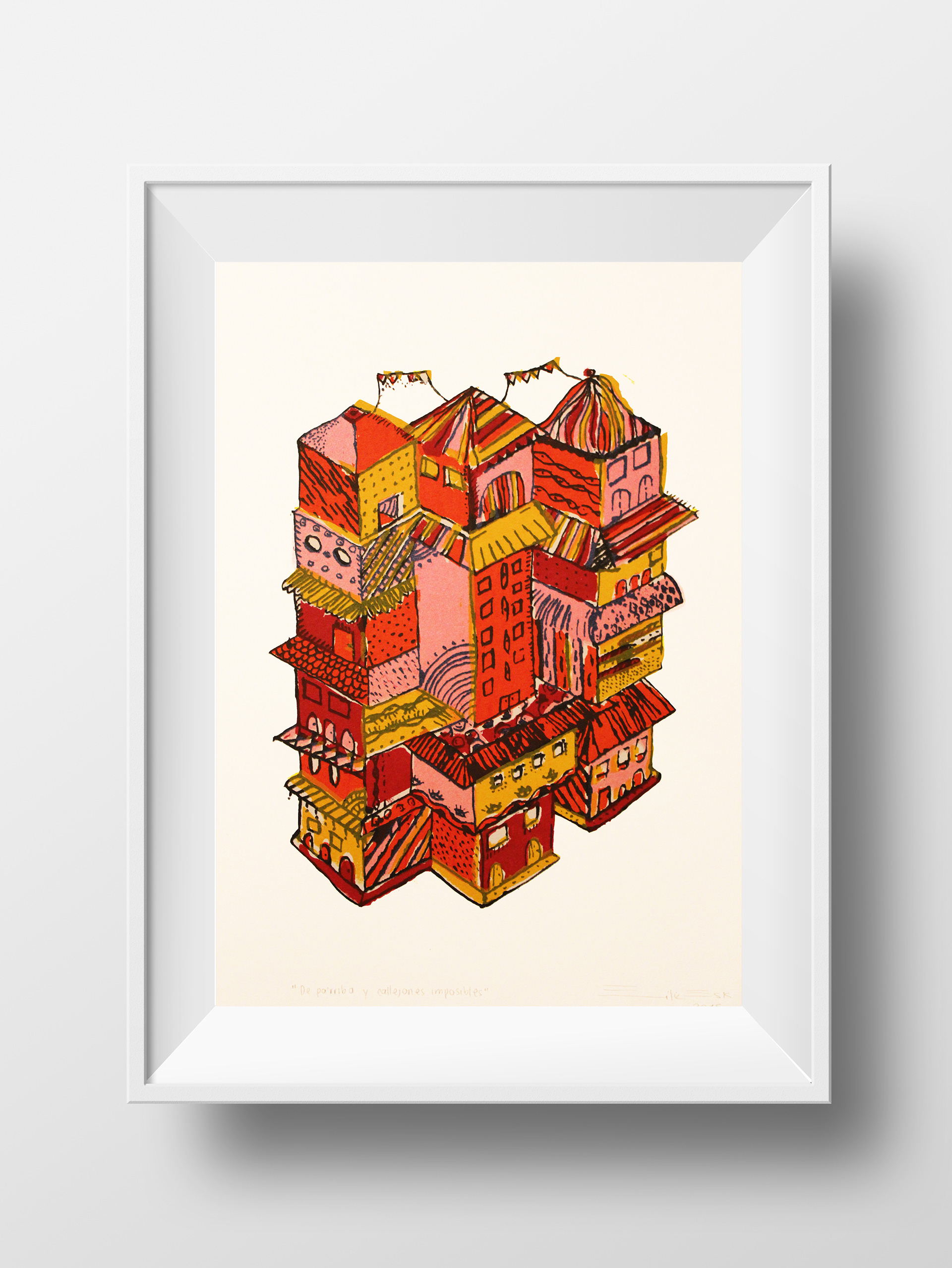 Impressions en sérigraphie, illustration inspirée des quartiers populaires de l'Amérique latine.