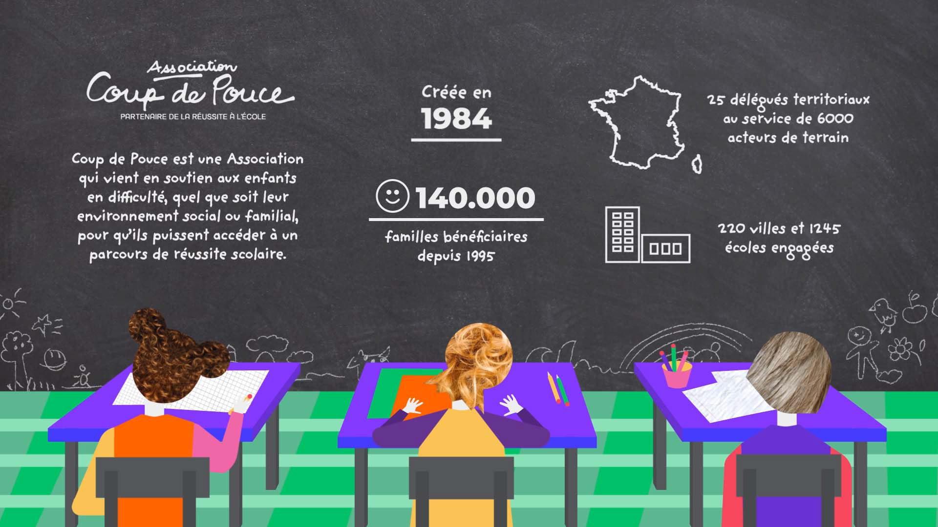 La fondation AlphaOmega accompagne les associations favorisant la mobilité sociale et l’éducation dans leurs changements d’échelle. Cette vidéo est un retour d’expérience sur la collaboration entre la Fondation AlphaOmega, Devoteam et l’association Coup de Pouce. Pour cette mission l’objectif était de communiquer les chiffres clés et les retours d’expérience d’une manière créative et ludique avec une identité visuelle associée au milieu de l’éducation.